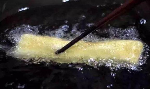 3.油锅烧到七成热,下油条坯子炸制,边炸边用筷子翻面。