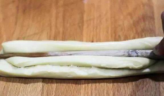 2.将面团整理成片状,像上图一样切成开,然后两片叠加,用筷子在中间按一条印。