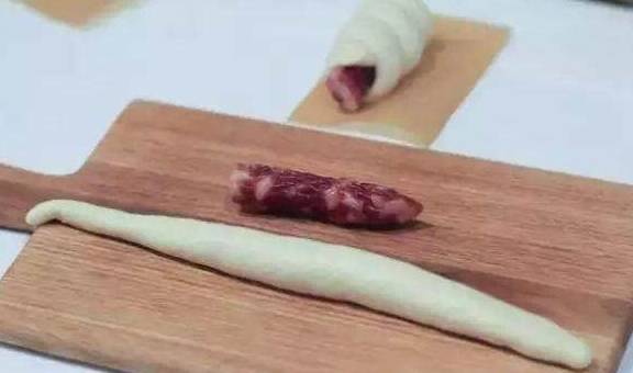 2.腊肠洗净切段,面团整理成长条状,按图中方式包裹腊肠。