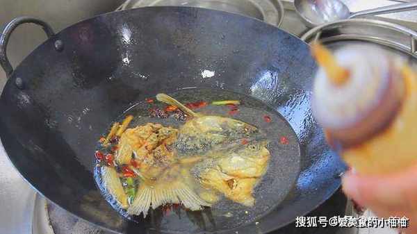 锅内烧油,油热以后,放入葱姜蒜,抓入八角2个,翻炒一会,炒出蒜香味以后,放入干辣椒几粒。加入适量的清水,放入炸好的鱼头和鱼尾。