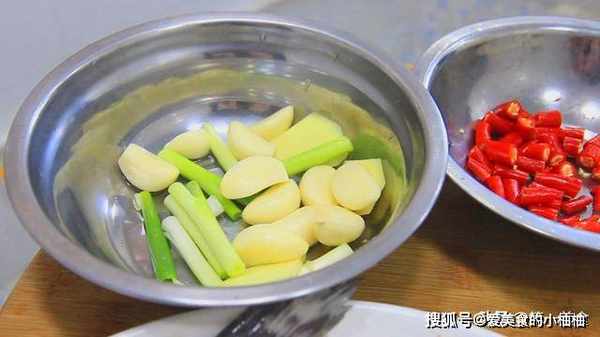 小葱切成葱段,生姜切成姜片。大蒜十几粒与葱姜一起放在盆中,小米椒切成辣椒圈。