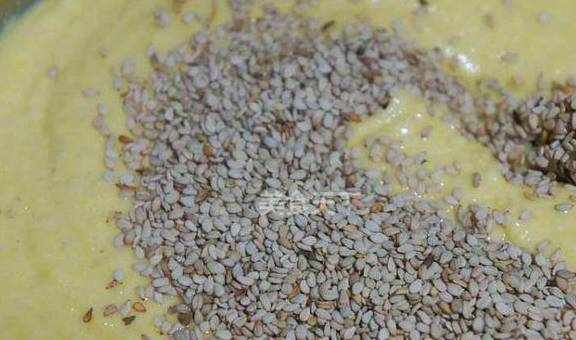 玉米面200g、面粉100g、鸡蛋2个、酸奶1盒、油适量、白糖适量、熟芝麻适量。