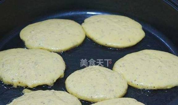 6.煎烤机中温预热,薄薄的刷层油,用勺子舀一勺面糊倒入锅中,一勺一个饼。