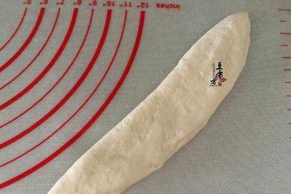 然后擀成舌型对边折起来,并盘卷起来压扁成饼型