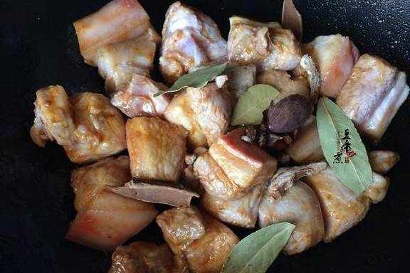 倒入肉与香料翻炒几下,加入没过肉的水及调料慢慢卤煮