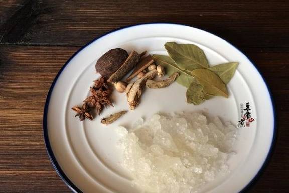 卤肉:五花肉1大块、草果1个、当归1片、桂皮1片、香叶3叶、八角3个、豆蔻4个、山奈1片、绍兴酒1碗、黄冰糖80克、老抽1匙、生抽3匙