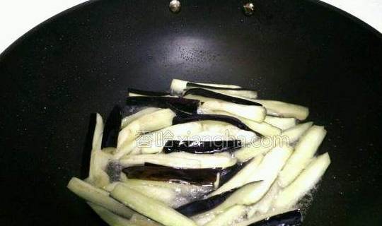 4.锅里放少许油,倒入茄子炒至变软,盛入盘