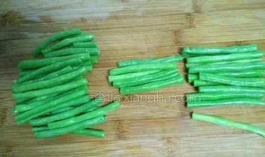 3.锅里水烧开,滴几滴油、少许盐,放入豆角焯水一分钟。捞出过冷水后,切寸段。