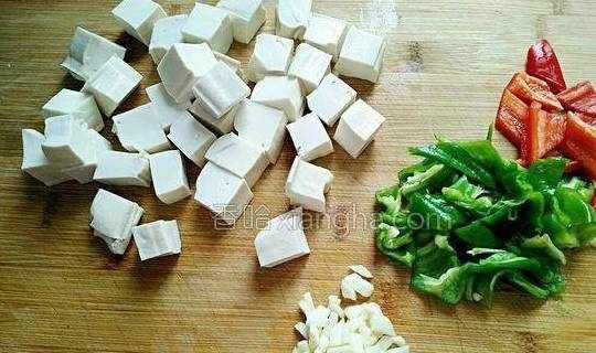 2.木耳提前泡发洗净,撕小块。豆腐切小块、青椒、红椒切小块、蒜切粒。