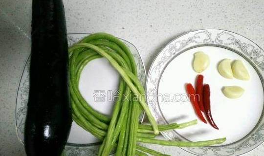 烹饪步骤:1.备好图中食材。豆角去掉两头再洗净,茄子、小米椒、蒜洗净。