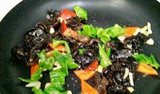 7.锅里留油烧热,放入蒜粒爆香,倒入青椒、红椒、木耳翻炒半分钟。