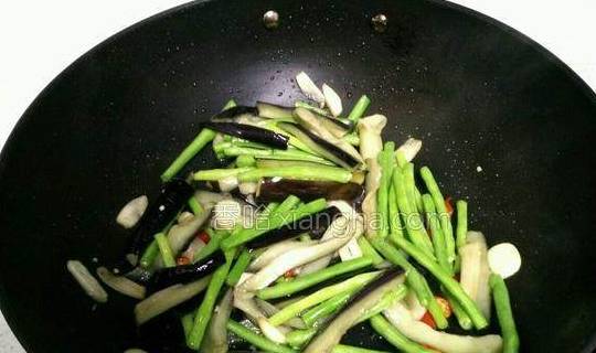 5.锅里留油烧热,放入小米椒结、蒜片炒出香味,倒入茄子、豆角翻炒。