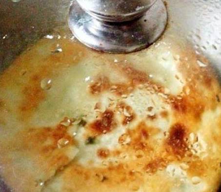 15、越小火三分钟后面饼会焦黄焦黄的,用铲子翻过来,再盖住锅盖