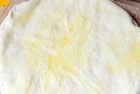 5、把面团擀平擀圆之后,放香油,把香油铺均匀在擀好的面饼上