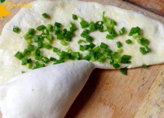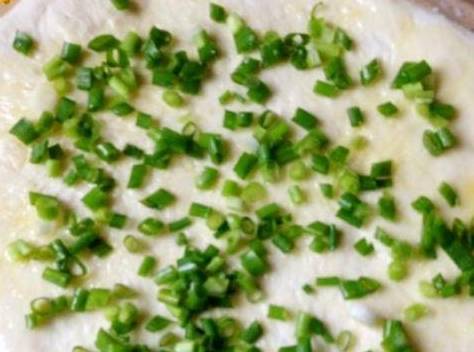 8、把切好的葱花均匀的撒到面饼上