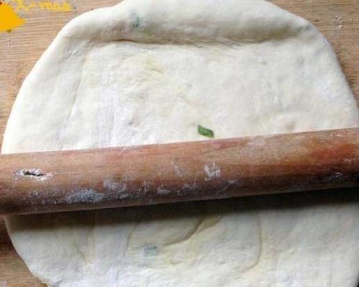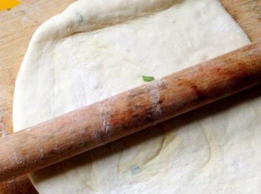 11、再把卷好的面团用擀面杖擀平