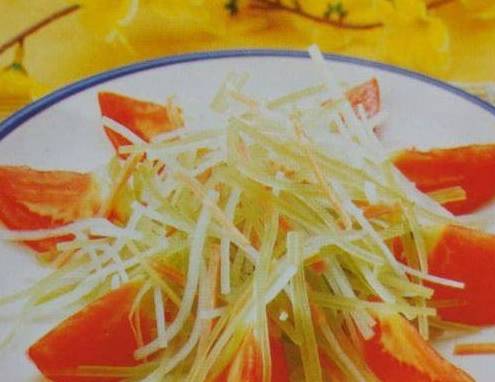 2、将番茄洗净,切成小块,放入装有白萝卜丝、莴笋丝、火腿丝的菜盘中,加入盐、味精、香油、糖、醋,拌匀即成。