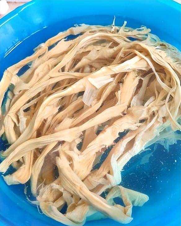 第一步,首先我们要提前准备好把干笋泡好。取出后,不要立即浸泡在冷水中。这时候,取完干笋,我们需要准备一盆温水。这个温水的温度最好在40度左右,不要太烫。