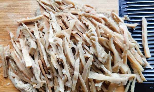 第四步,然后,我们将泡发好的干笋取出,沥干水分,放在案板上切成小块,进行下一步的烹调。是用来炖肉,煎肉等吗?它们香脆可口,开胃,超级简单。
