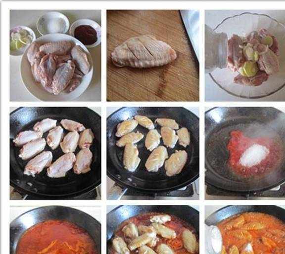 制作:1.准备好材料;2.将鸡翅的表面划上两刀;3.鸡翅中加入适量的盐、料酒和姜片、大葱等调味腌制一下;4.热锅少许油,将鸡翅正面放入里面去煎;5.一面煎至金黄后翻面将另一面也煎至金黄后盛出来;6.锅中底油中放入番茄酱和糖翻炒一下;7.倒入适量的水煮开;8.将煎好的鸡翅倒入去煮三分钟;9.大火收汁,加入适量的盐调味即可;
