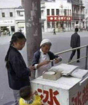 3.冰棍,小编也不知道这是什么东西,但是可以看出来那个时候的街道还很一般,没有现在这么多的高楼,你吃过这种零食吗?知道这是啥小吃吗?