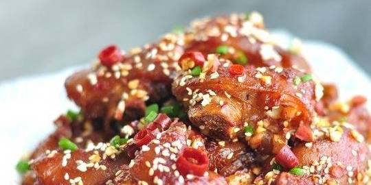 猪蹄洗净对半切开,姜,大蒜,葱切片。放入少许的料酒,锅中烧水开后放入猪蹄,锅滚后捞出掉浮沫。菜锅放油加热,放入辣椒、花椒、大料、姜,大蒜,葱炒香。放人猪蹄继续翻炒,加盐,老抽,醋调味。加水没过猪蹄。大火烧开转小火至猪蹄熟烂,大火收汁!