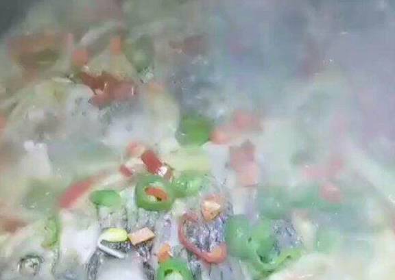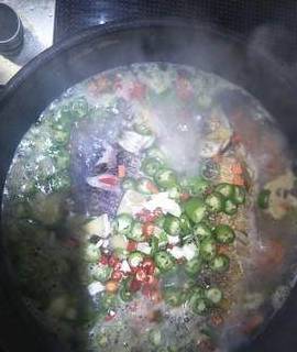 放入尖椒,小米椒,姜,蒜和秘制辣酱,用中火煮至汤汁收干即可。