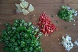 把尖椒和小米椒切圈,姜切片,葱切段,蒜切沫待用。