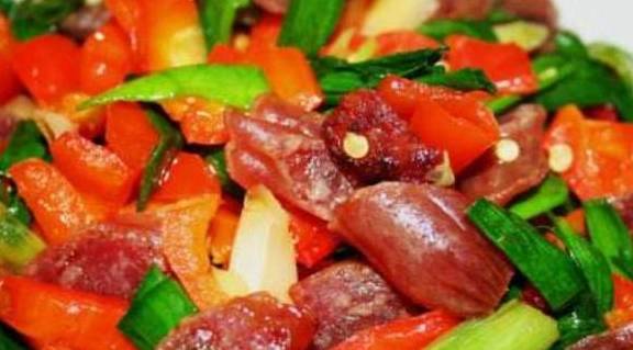 备料:蒜苗20克,甜香肠2个,姜5克,细红椒2个,植物油50克,盐2克,鸡精3克,料酒5克。