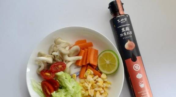 辅料:生菜胡萝卜玉米粒白玉菇小番茄青柠檬洋葱黑醋色拉汁