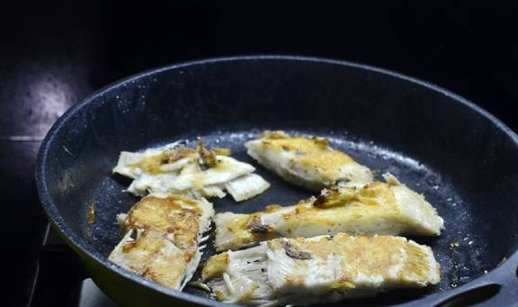 热锅烧热橄榄油将腌制好的鱼块放入,煎至两面微黄至熟