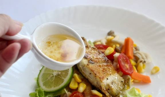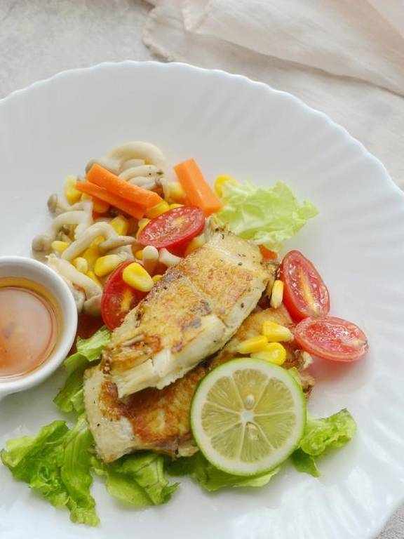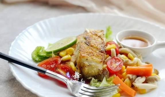 将辅料和鱼块摆盘,然后浇上洋葱黑醋色拉汁即可(黑醋汁也是瘦身减肥的最佳调味品,多吃不腻)