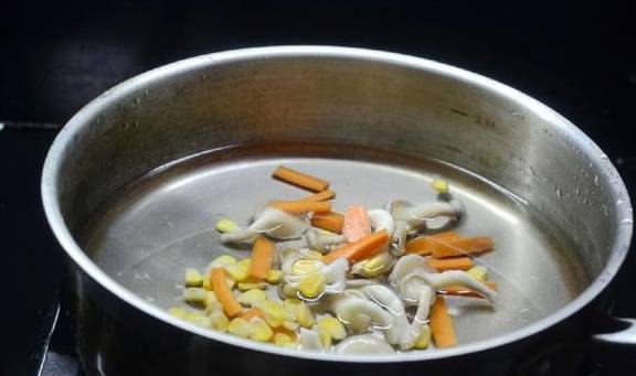 胡萝卜切条和玉米粒、白玉菇放入锅内焯烫捞起
