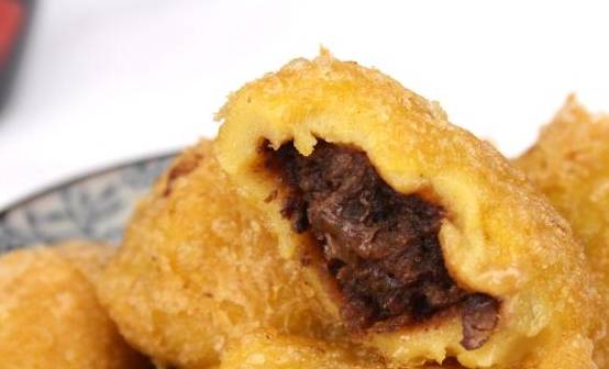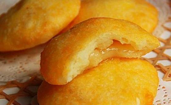 此时的糕面已经蒸得差不多了,趁热用手揉一下,将表面揉搓光滑,并搓成长条,切成大小一样的剂子。将每个剂子按成小饼,将馅料放入,包起来,类似于包饺子,在锅中倒入油,烧热后转为小火,将刚刚包好的糕放入。在炸的过程中多次翻面,让两面都受热均匀一些,等到两面都金黄了就可以出锅了。