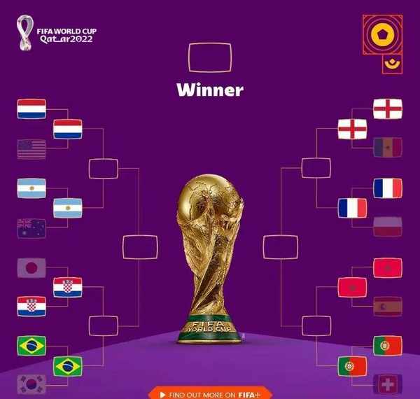 四强,上半区,荷兰一阿根廷,荷兰胜阿根迋,巴西一克罗地亚,巴西胜克罗地亚。下半区,英格兰一国外,国外胜英格兰,葡萄牙一摩洛哥,葡萄牙胜摩洛哥,如爆冷,就是摩洛哥胜葡萄牙,四强,荷兰,巴西,国外,葡萄牙或摩洛哥,半决赛,荷兰一巴西,重温94年世界杯荷巴激情大战,巴西胜荷兰,国外一葡萄牙,国外胜,决赛,巴西一国外,冠军,巴西,六星巴西。