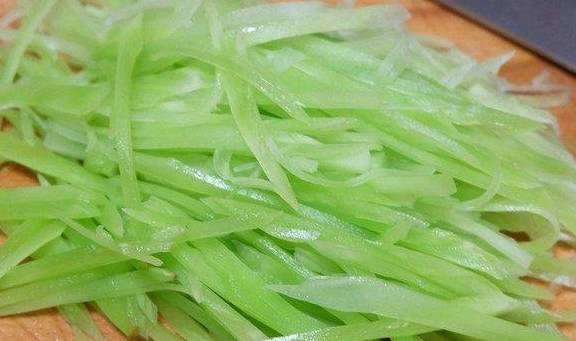 1、莴笋去皮切成细丝,切的越细越好,不建议用擦丝器,擦出来的没有切出来的味道好;