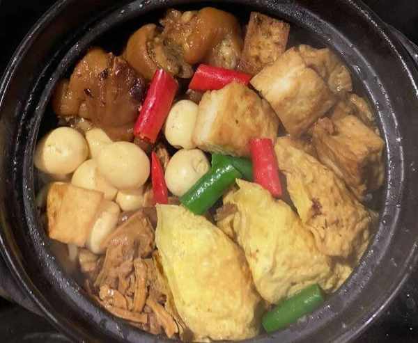鸡肉500克、鹌鹑蛋300克、猪脚500克、豆腐300克、鸡蛋3个、笋干100克、生抽适量、老抽适量、料酒黄酒适量、姜1块、冰糖适量、盐适量、肉馅少许、淀粉少许、花椒少许、八角2颗、桂皮少许、香叶2片