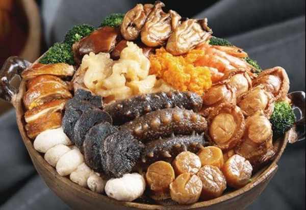 主料:鸡肉100克,水发海参50克,熟白鸡肉50克,熟火腿50克,油发鱼肚50克,水发鱿鱼50克,水腐竹50克,蛋黄糕50克,鸽蛋12个,净鱼肉100克,水发玉兰片100克,水发冬菇30克,熟白猪肚100克,干贝10粒。