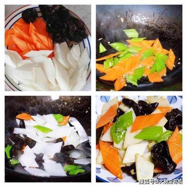 4、锅中加油,加入胡萝卜片、青椒片,快速翻炒。随后在锅中倒入木耳和山药,加入盐、鸡精、味精、蚝油调味。为了保持爽脆的口感,炒这道菜时,最好全程使用大火。