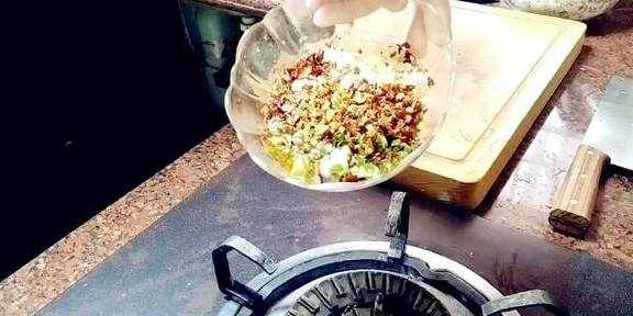 蒜末、姜末、葱花、辣椒粉放在一个碗中,锅中烧热油泼在碗中,搅拌均匀。