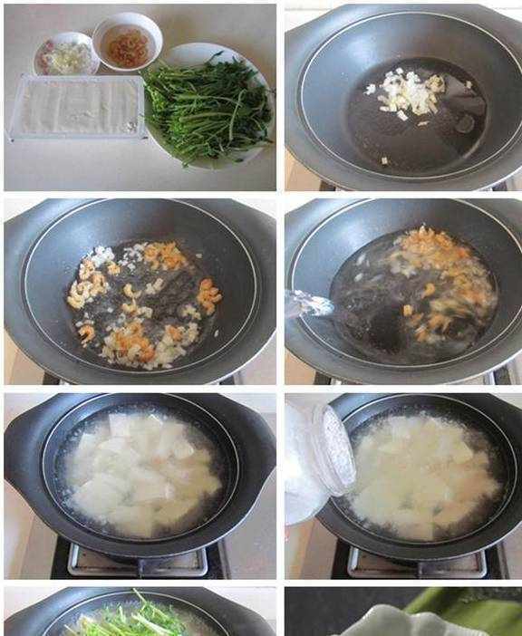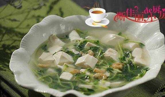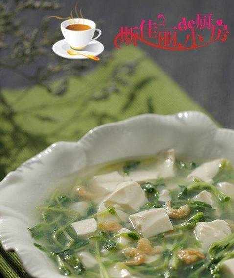 原料:嫩豆腐1盒豌豆尖1把虾米1小把姜蒜末1小勺油盐适量
