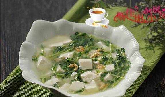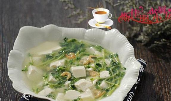 制作:1.准备好原材料,虾米提前泡水;2.热锅凉油,放姜蒜末进去爆香;3.再放入泡过的虾米进去煸炒;4.煸炒两下后加入适量的水炖煮二、三分钟;5.下入豆腐块;6.加入适量的盐和胡椒粉调味;7.下入豌豆尖,变色后关火;8.盛入钵中。