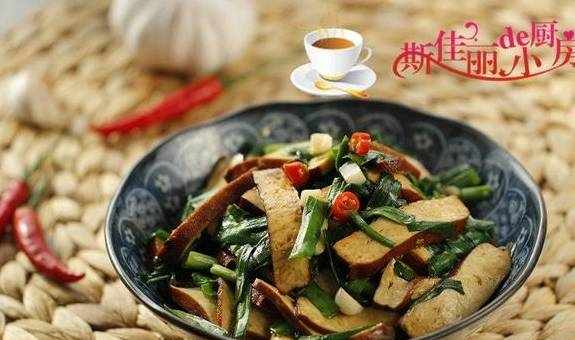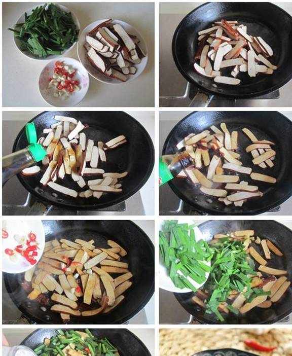 制作:1.准备好原材料;2.热锅凉油,放入香干进去翻炒;3.加入些生抽翻炒上色;4.再加入点蚝油提鲜,翻炒均匀;5.加入蒜和红椒圈翻炒均匀;6.放入春韭进去翻炒;7.微微变色后加入盐翻炒均匀;8.盛入碗中。