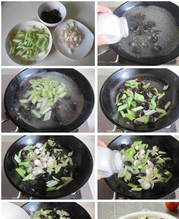 制作:1.准备好材料;2.烧锅开水,将木耳放入里面焯一下,加入点盐;3.木耳快焯好时放入西芹进去焯一下,变色后捞出;4.热锅凉油,放入焯好的西芹和木耳进去翻炒;5.再加入百合进去翻炒;6.加入点盐调味;7.再加入适量的水淀粉勾玻璃芡;8.盛入盘中。
