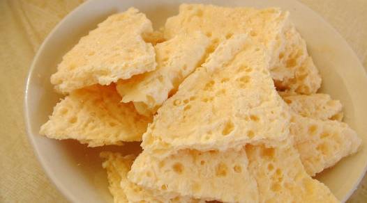 奶皮子:蒙语称“查干伊德”,“乌如木”、“乌日莫”。汉语的意思就是“白色的食品”。制做奶皮的原料系鲜奶,要制作一斤奶皮,需用去八斤鲜奶。因此,经济条件一般的人家,是不大多做奶皮的。制做奶皮时,需将刚挤出的鲜奶,在纱布中过滤几遍,使奶液不掺任何杂质。然后把鲜奶倒入大口铁锅中,待奶液稍微滚沸起来后,就用勺子不停地上下翻扬,至到鲜奶泛起银多的泡沫时,再把炉膛的火撤出,使奶液慢慢冷却,第二天,就有一层蜂窝状麻面的奶脂,凝结于奶液的表面。这时候,就用双手把凝结的奶脂轻轻揭起,倒扣在盘中或木板上,置于通风处阴干,一张完整的奶皮就做成了。