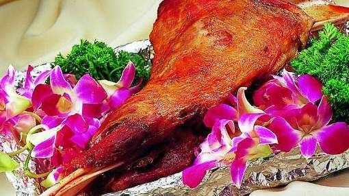 烤羊腿:烤羊腿是呼伦贝尔招待宾客的一道佳肴名菜。烤羊腿菜形美观,颜色褐红,肉质酥烂,味道香醇,色美肉嫩,浓香外溢,佐酒下饭,老少皆宜,实乃各式烤羊腿成品草原美肴之一。"烤羊腿"是蒙族名菜,流传广远,西北各地,皆有制作。此菜以羊腿为主料,经腌制再加调料烘烤而成。成菜羊腿形整,颜色红润,酥烂醇香,滋味鲜美,回味悠长。