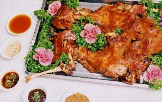 烤全羊:烤全羊是内蒙古自治区少数民族,尤其是蒙古族人民膳食的一种传统地方风味肉制品,烤全羊是目前肉制品饮食中最健康最环保最绿色的美食了,烤全羊外表金黄油亮,外部肉焦黄发脆,内部肉绵软鲜嫩,羊肉味清香扑鼻,颇为适口,别具一格。