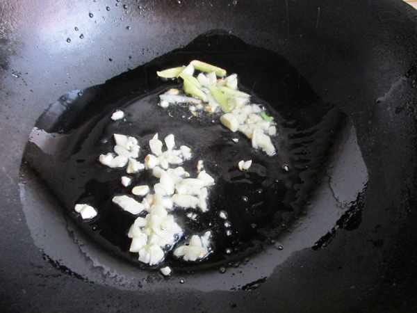 第二步:油麥菜的做法也很簡單,鍋裏放入花生油,放上蒜末炒出蒜香味。