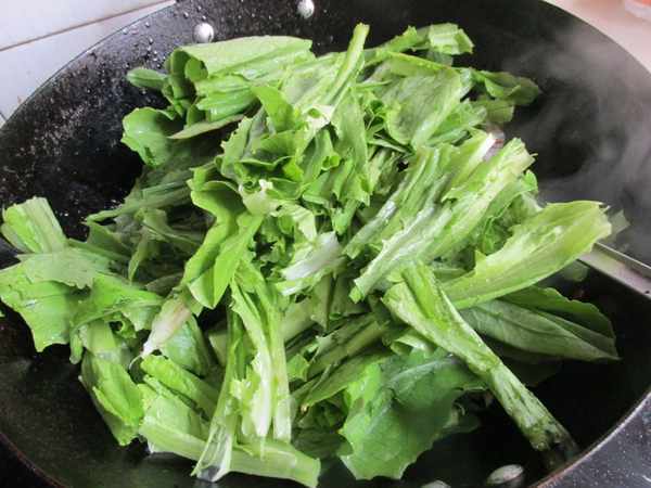 第四步:倒入油麥菜,大火煸炒均勻。