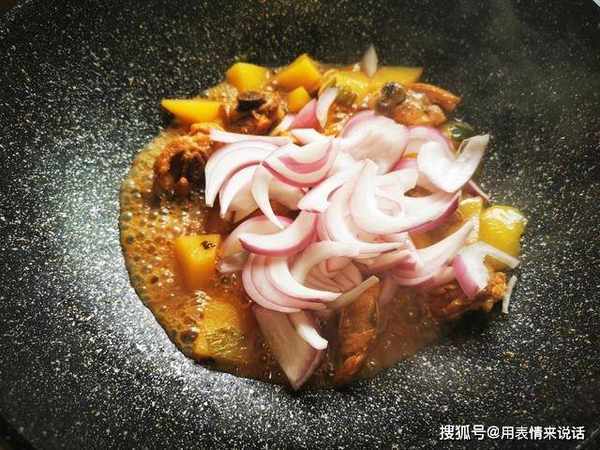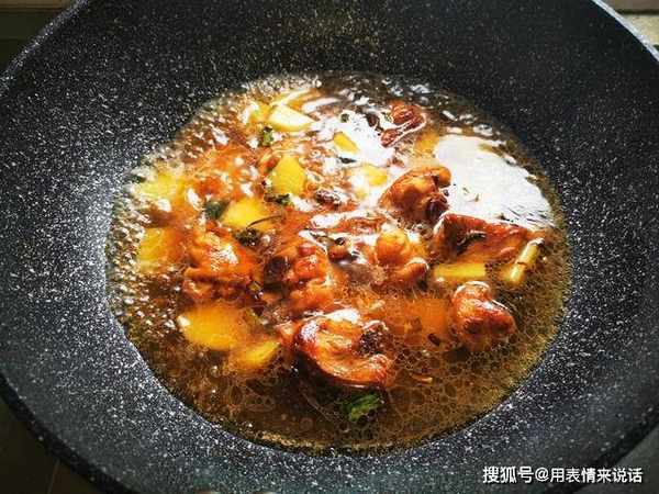 10、汤汁收的差不多的时候,土豆和鸡肉块也都成熟了,这个时候我们放入洋葱翻炒,加入食盐调味。